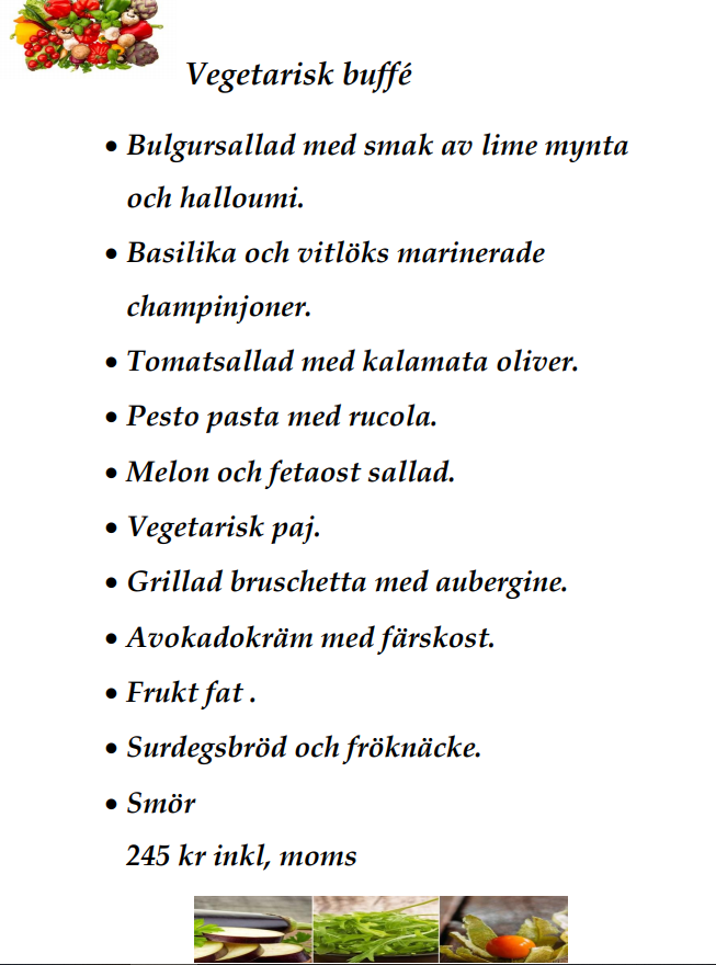 Här har vi lite olika menyförslag, kolla gärna igenom de olika menyerna och känner du att du vill ha lite av varje så går det självklart att komponera ihop din alldeles egna och unika meny eller buffé.